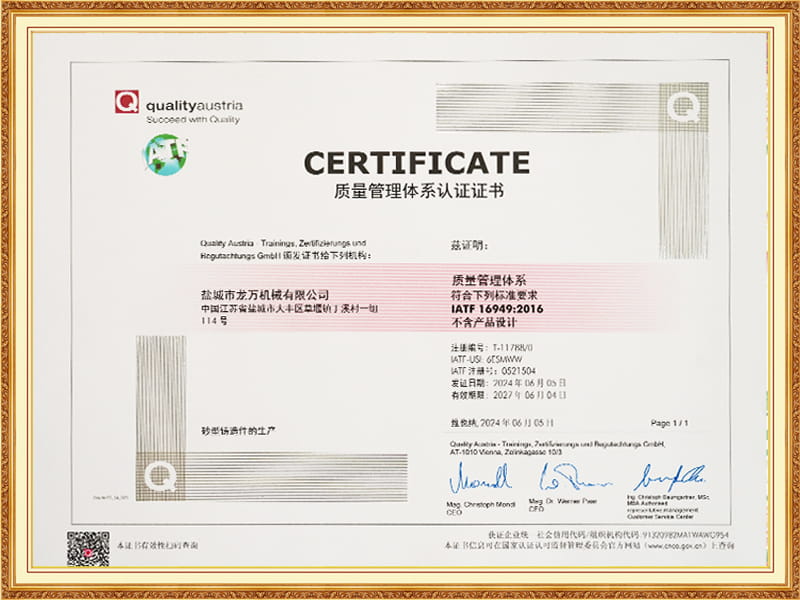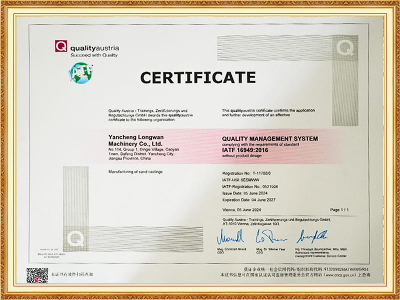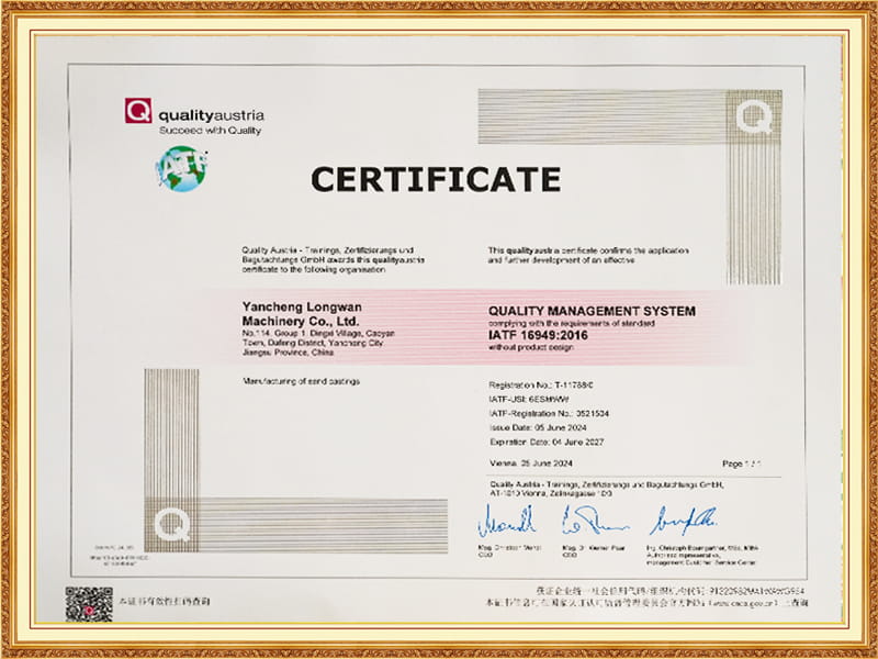 In aice leis, tá an cumas againn freisin cáilíocht an phróisis iomláin a iniúchadh, agus tá trealamh tástála feidhmíochta ábhartha againn, mar shampla speictriméadar léitheoireachta díreach Spectro Spectro, meaisín tástála teanntachta, tástálaí cruas 3T Brinell, méadar treoluas sonic, micreascóp miotail, etc.; Tá sraith iomlán de threalamh tástála gainimh múnlaithe ar nós Meaisín Samplach Samplaí de chineál Sac, Meaisín Tástála Neart Hiodrálach SWY, Meaisín Scagtha Gaineamh Cineál SSZ, SGS DISC DISC TRIOMA $ $ DER, etc., agus bhunaigh sé caighdeán córais IATF 16949: 2016 chun a chinntiú go mbeidh cobhsaíocht leanúnach an cháilíocht táirge.