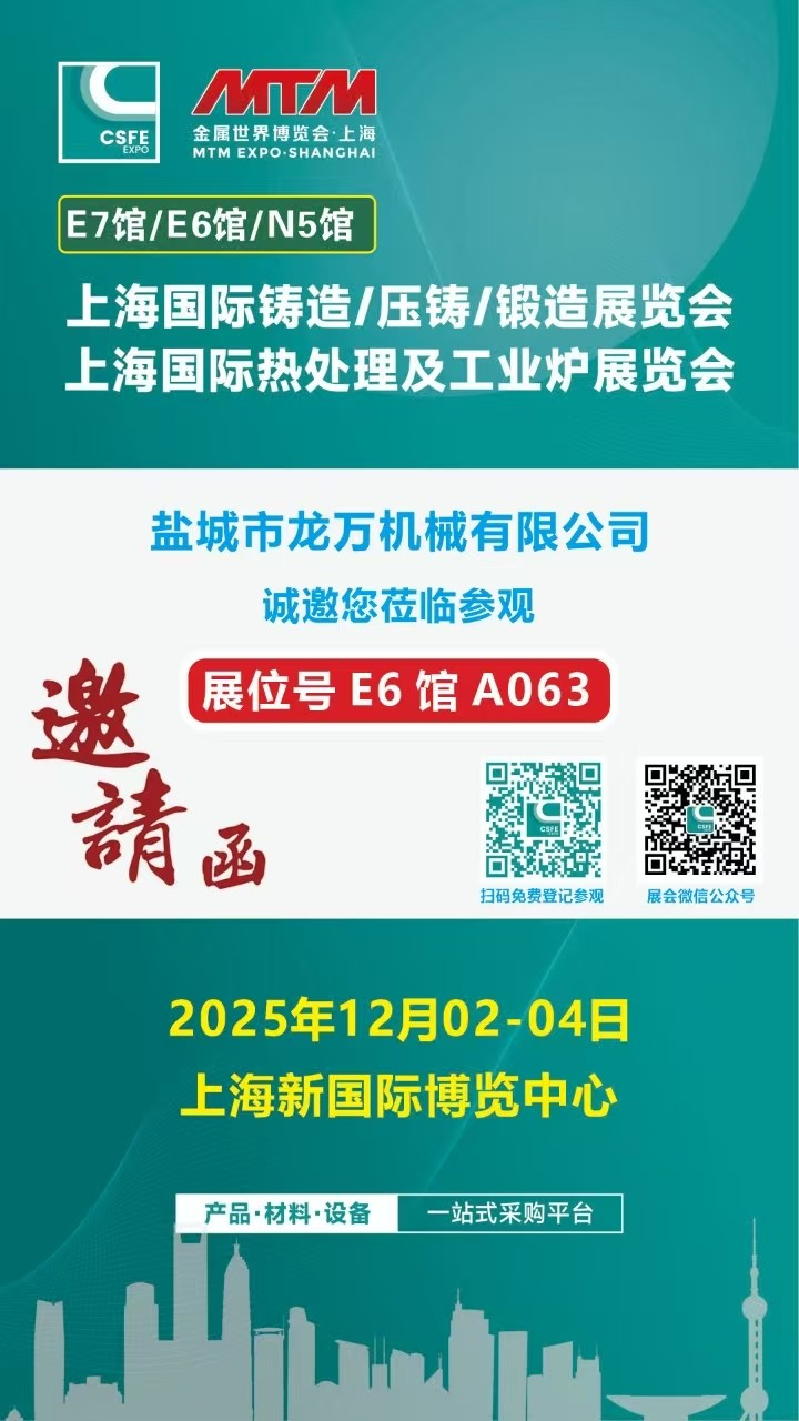 Beidh Yancheng Longwan Machinery Co., Ltd. rannpháirteach sa “Taispeántas Idirnáisiúnta Cruach/Dísleilgthe/Teilgcheárta” agus “Taispeántas Idirnáisiúnta um Chóireáil Teasa agus Foirnéise Tionscail Shanghai” a bheidh ar siúl ag Lárionad Idirnáisiúnta Expo Shanghai ó 2 Nollaig go 4, 2025. Meallann an taispeántas seo go leor cuideachtaí móra ó na tionscail cruach, réitigh agus cóireála teasa. Úsáidfidh Yancheng Longwan Machinery Co., Ltd an t-ardán seo chun a chuid teicneolaíochtaí is déanaí agus táirgí nuálacha a thaispeáint sa réimse déantúsaíochta innealra.